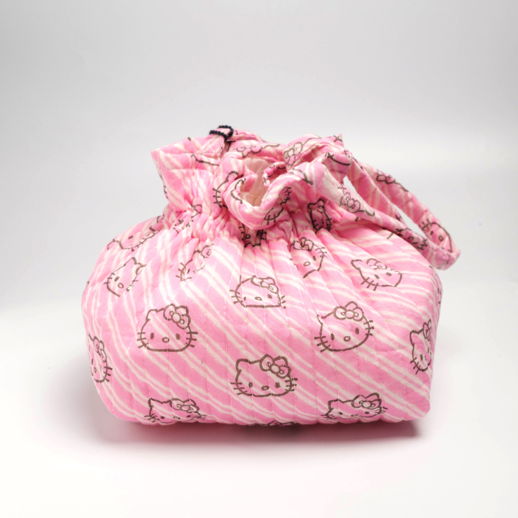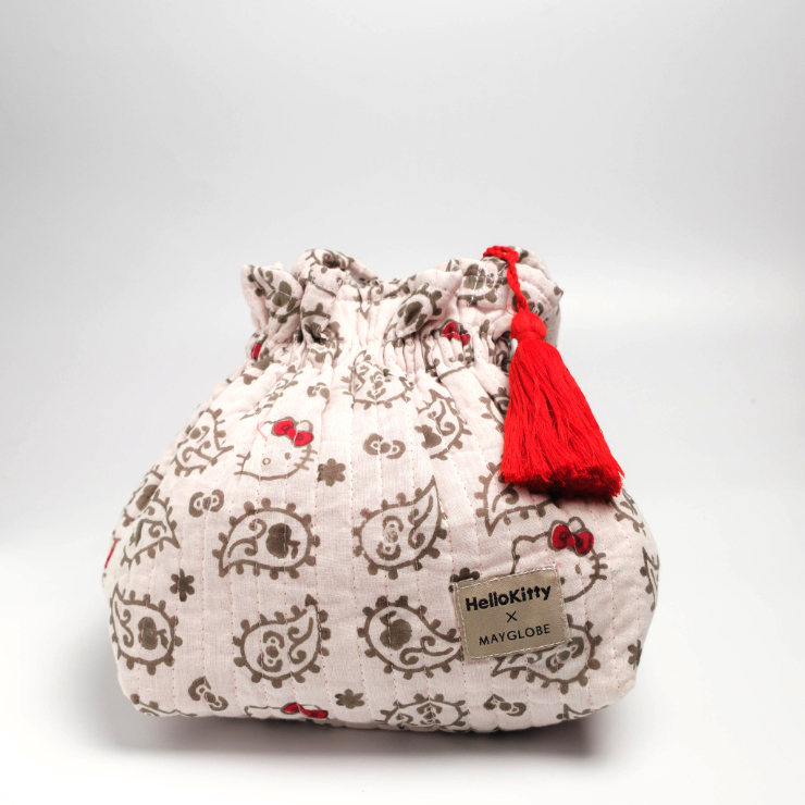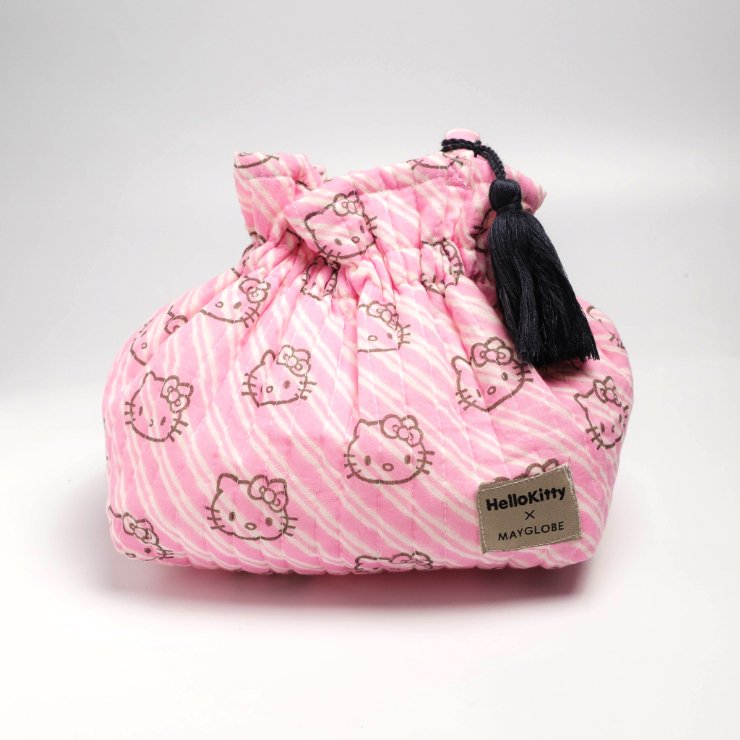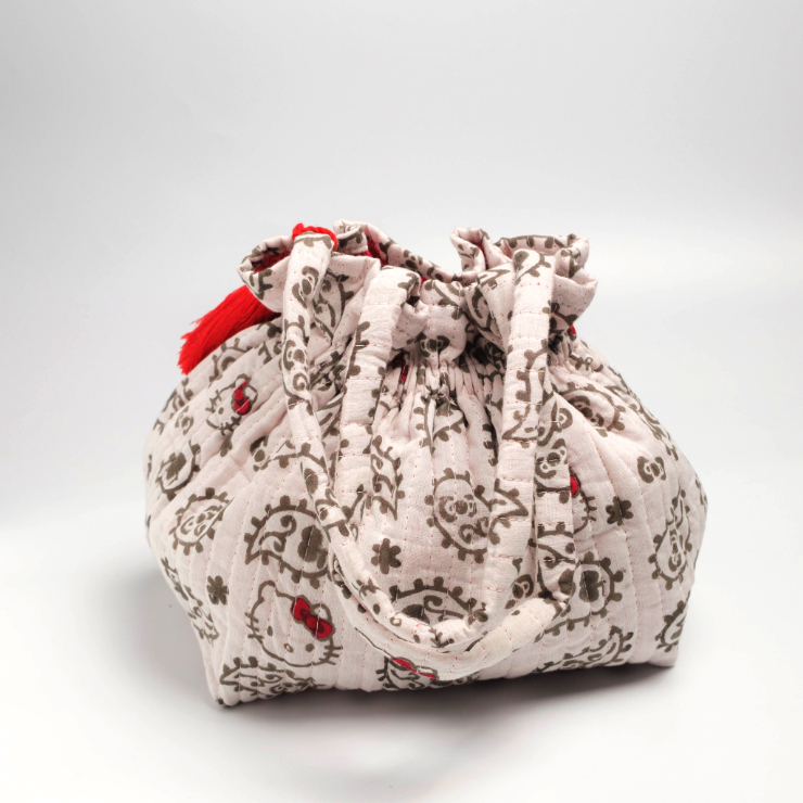 インドで起源前から語り継がれていると言われているブロックプリントという技法で作ったハローキティの生地を巾着バッグにしました。ブロックプリントは幾重にもインクを重ねていくため、大変手間がかかる技法ですが、その分、機械では出せないハンドメイドならではの優しい風合いが生み出されます。生地のデザインはもちろん、ブロックプリントの木版も手作りするところから企画しました。コットンケンブリック地をキルティング加工し、肌触りもよく、軽やかで柔らかくなっており、素材にもこだわりました。