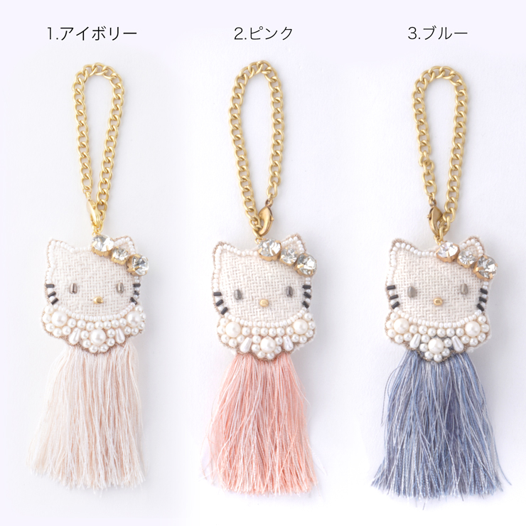 ゴージャスなビーズ刺繍でデザインされたハローキティの立体的なバッグチャーム。ハローキティはもちろん、フリンジ付きの存在感抜群のバッグチャームです。ハローキティモチーフの、派手すぎない上品な輝きはハンドメイドビーズのカットによるもの。バッグはもちろんカーテンタッセルなどインテリアの一部としてお使いいただくのもおすすめです。可愛さと上品さを兼ね備えたチャームはプレゼントにもおすすめです。