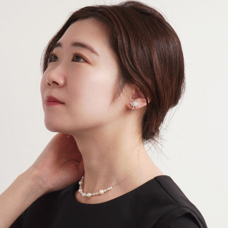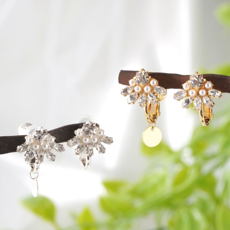 | 素材 | ベース:合金・真鍮メッキ加工 / アクリルパール / ガラスストーン / ピアス(チタンポスト)/ ネジイヤリングパーツ(ニッケルフリー)・ゴム / ガラスストーン |